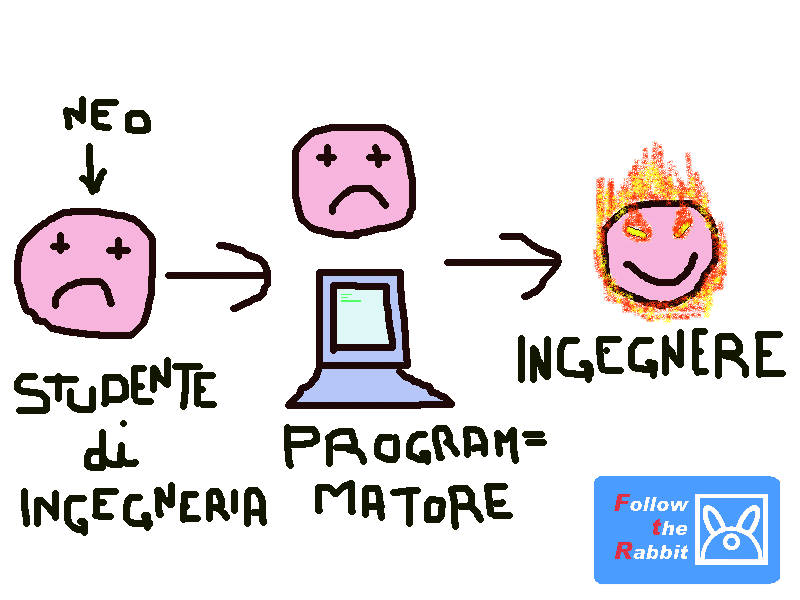 Il tragicomico mistero del lavoro di Neo si trascina ormai da qualche settimana. Direi che questo è in accordo con la realtà: chi può mai infatti stabilire con esattezza quale sia il lavoro di un ingegnere? Chi può provare la sua utilità nella società? Si consideri oltretutto che Neo ancora non è assurto all'agognata carica, ma è ancora un semplice tirocinante, un ragazzo de bottega, un uomo che deve farsi le ossa sui computer aziendali e quindi ancor più si viene a perdere il significato del suo zelante sgobbare. Indubbiamente le indagini per comprendere e sviscerare la professione del nostro si è raggiunto quando è stato richiesto A ME un disegnino sull'argomento! A ME! Ma vi rendete conto di quale assurdità questa sia? Me la rido AH AH AH! Me la rido AH AH AH! Perchè comunque indosso la maglia di lana...